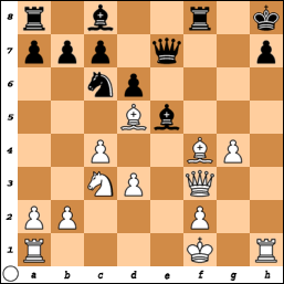 [ Rxh7+ if Qxh7 Bxe5+ or if Kxh7 Qh3+ ]