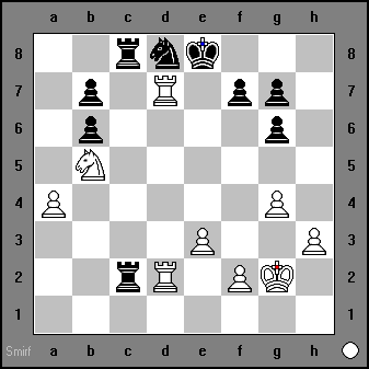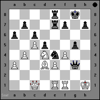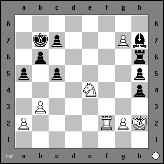 74) ...Qe2+ Qxe2 Rxh7+ Rh3 Rxh3+ Kxh3 Nxf4+ |
