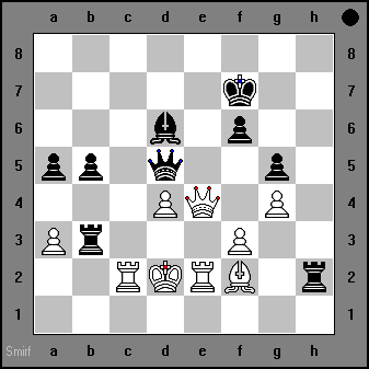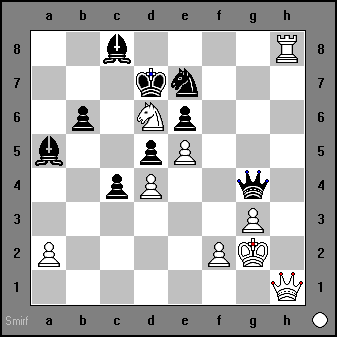 68) ...Rxg2+ Kxg2 Qg4+ Kf1 Qh3+ Ke2 Qg2+ Kd3 Nf2+ |